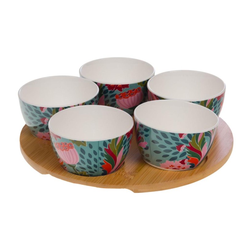 Apportez élégance et convivialité à vos moments gourmands avec le service apéritif 5 pièces Isaline signé Amadeus. Ce coffret raffiné se compose de cinq bols en porcelaine fine, délicatement ornés d’un motif floral coloré, présentés sur un plateau en bois naturel. À la fois pratique et décoratif, il invite à partager des apéritifs pleins de charme et de fraîcheur, que ce soit en famille ou entre amis. Un indispensable pour sublimer vos tables et créer une ambiance chaleureuse et raffinée.