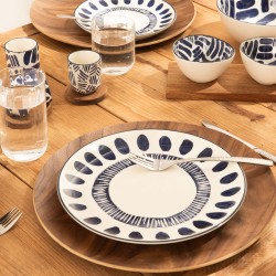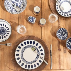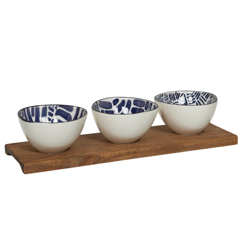 Le service apéritif Milos réinvente l'art de recevoir avec une élégance naturelle et contemporaine. Composé de 3 bols en grès aux intérieurs décorés de motifs graphiques bleu marine , formes organiques, tirets rythmés et feuillages stylisés : chaque bol révèle un décor unique qui se dévoile au fil du repas. Posés sur leur plateau en bois naturel, les trois bols s'inscrivent dans une présentation soignée, prête à poser directement sur la table. L'extérieur blanc mat des bols contraste harmonieusement avec la chaleur du bois, pour un rendu à la fois épuré et chaleureux. Fabriqué en grès de qualité, ce service allie robustesse et finesse. Idéal pour présenter olives, tapas, noix, trempettes ou mises en bouche, il s'adapte aussi bien à un apéritif décontracté qu'à une table dressée avec soin. Sa longueur généreuse de 35 cm en fait une pièce centrale et décorative qui habille la table avec caractère. La collection Milos de Table Passion puise son inspiration dans l’élégance méditerranéenne. Ses motifs graphiques bleu intense, peints sur une porcelaine blanche raffinée, apportent caractère et modernité à la table. Déclinée en bols, coffrets apéritifs et tasses, cette collection invite au voyage et sublime aussi bien les repas quotidiens que les moments conviviaux.