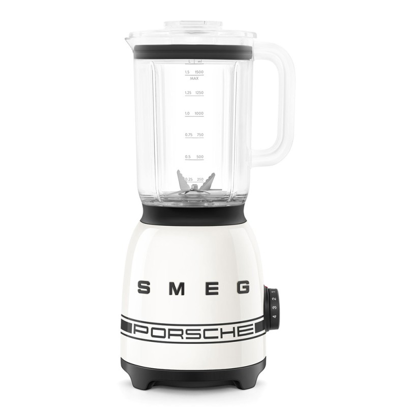 Blender 1,5 L co-brandé SMEG x Porsche, finition blanc laqué au design rétro-sportif. Bol gradué en verre 1,5 L, lames en inox et socle en métal peint avec éléments ABS , commande à molette latérale pour plusieurs vitesses. Article premium photogénique, fort pouvoir attractif grâce au co-branding, idéal pour enrichir une gamme électroménager design et augmenter le panier moyen. Produit unitaire, positionnement haut de gamme.