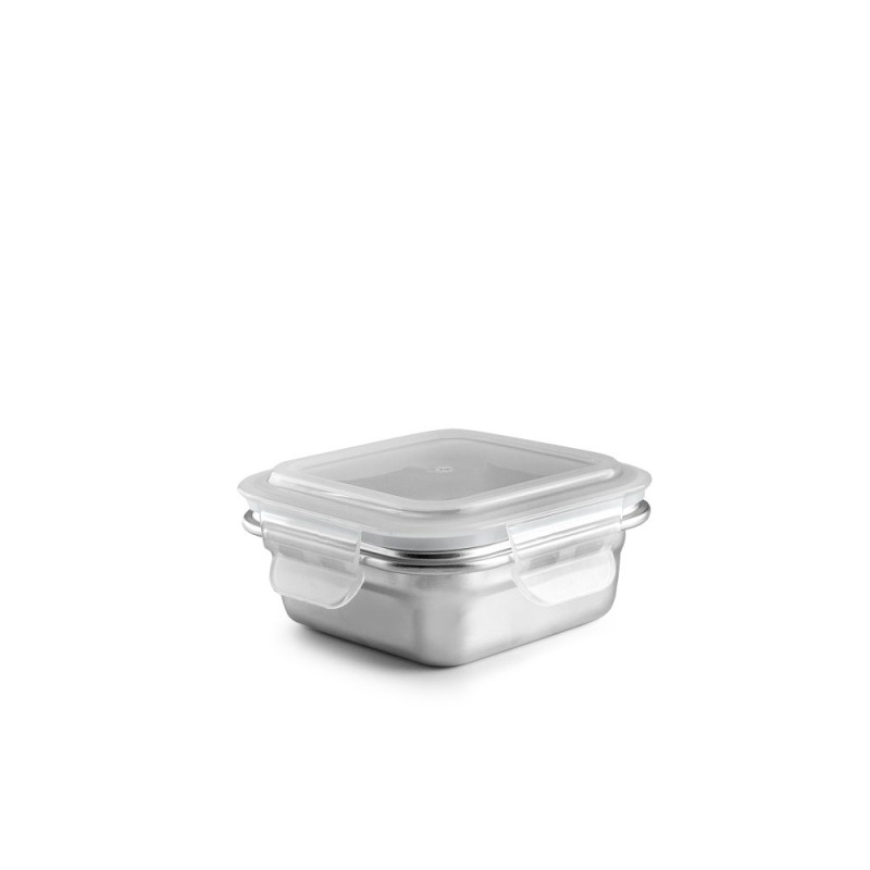 Boîte carrée hermétique en inox (300 ml) avec couvercle clipsable en plastique transparent. Conçue pour la conservation et le transport d'aliments, elle apporte durabilité, hygiène et facilité d'entretien (inox résistant, compatible lave-vaisselle pour la partie métal). Format compact (10 x 10 x 4 cm) idéal pour compléments d'offre lunchbox et accessoires cuisine. Produit différenciant par sa finition inox et sa fermeture sécurisée.