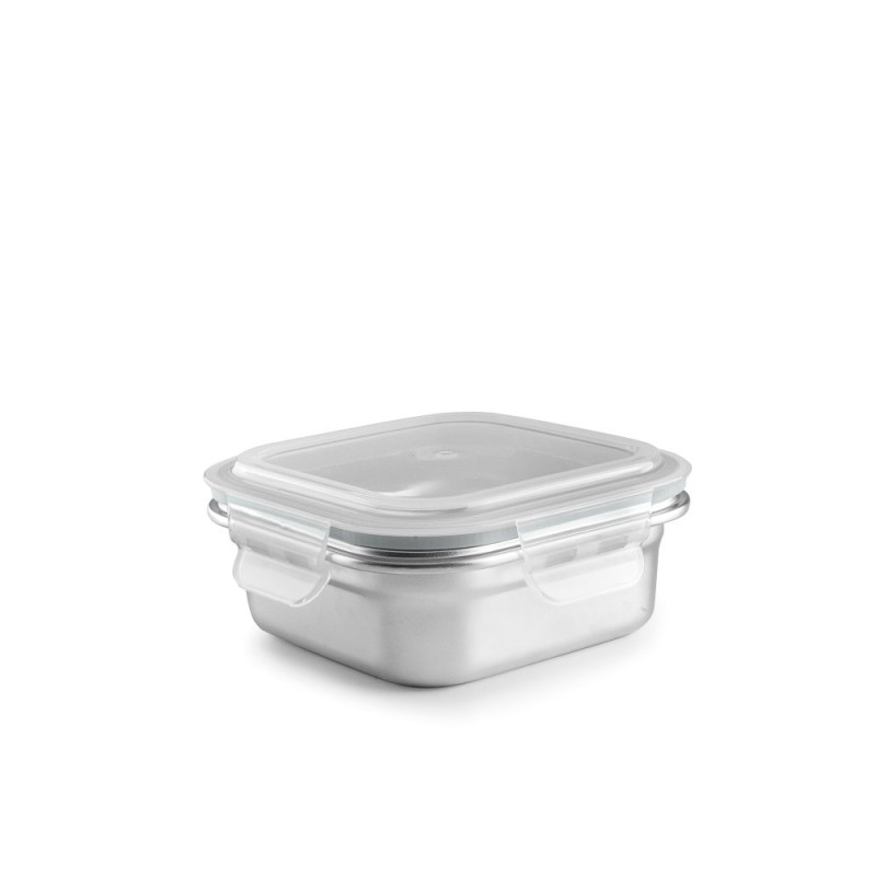 Boîte alimentaire carrée en inox 500 ml, conçue pour la conservation et le transport d'aliments. Corps en acier inoxydable durable avec couvercle hermétique en plastique transparent munis de clips latéraux pour une fermeture sécurisée. Format compact (13 x 13 x 4 cm) facile à stocker et à présenter en catalogue. Produit réutilisable, hygiénique et robuste, adapté à une gamme d'accessoires cuisine éco-responsables et nomades.