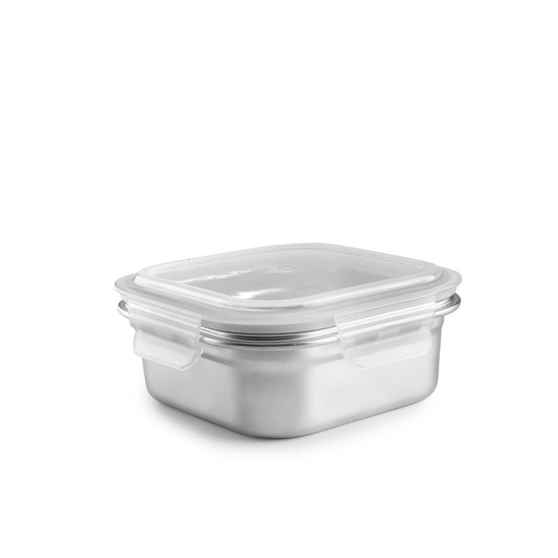 Boîte alimentaire carrée en inox 800 ml avec couvercle hermétique à clips. Design compact (14 x 14 x 5 cm) adapté au rangement et à la conservation, inox brossé durable résistant aux taches et aux odeurs. Couvercle transparent avec joint silicone assurant l'étanchéité et clips latéraux sécurisés pour le transport. Produit idéal pour élargir une gamme d'accessoires cuisine réutilisables, valorisable en catalogue par son aspect pratique et durable.