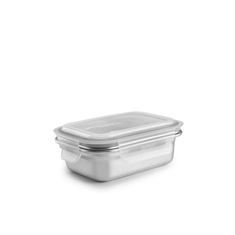 Boîte rectangulaire hermétique en inox d'environ 600 ml, adaptée à la conservation et au transport d'aliments. Corps en acier inoxydable résistant à la corrosion et au contact alimentaire, couvercle transparent avec joint silicone et clips de verrouillage pour une bonne étanchéité. Idéale pour diversifier une gamme d'articles de cuisine réutilisables : durable, facile à entretenir et valorisable en catalogue zéro déchet.