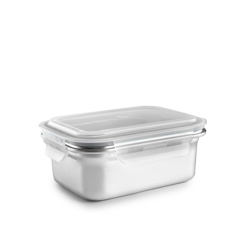 Boîte rectangulaire hermétique en inox (capacité 800 ml) avec couvercle translucide à clips. Conçue pour une présentation produit performante en rayon ou catalogue : matériau durable, hygiénique et recyclable, adaptée à la conservation et au transport alimentaire. Produit facile à stocker et à photographier, valeur ajoutée pour une gamme d'articles de cuisine fonctionnels et haut de gamme. Idéale pour la revente comme contenant réutilisable.