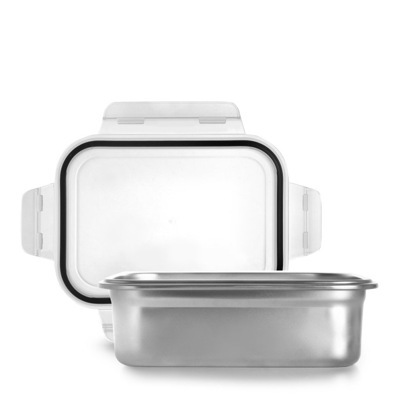 Boîte rectangulaire en inox avec couvercle hermétique en plastique transparent et joint silicone. Dimensions compactes (19 x 14 x 6 cm) adaptées au transport de préparations culinaires, conservation au réfrigérateur et présentation. Matériaux durables et faciles à nettoyer, convenant à la vente en cuisine utilitaire, magasins d'articles ménagers ou restauration. Produit pratique pour valoriser une gamme zéro-déchet et gain de place en rayon.