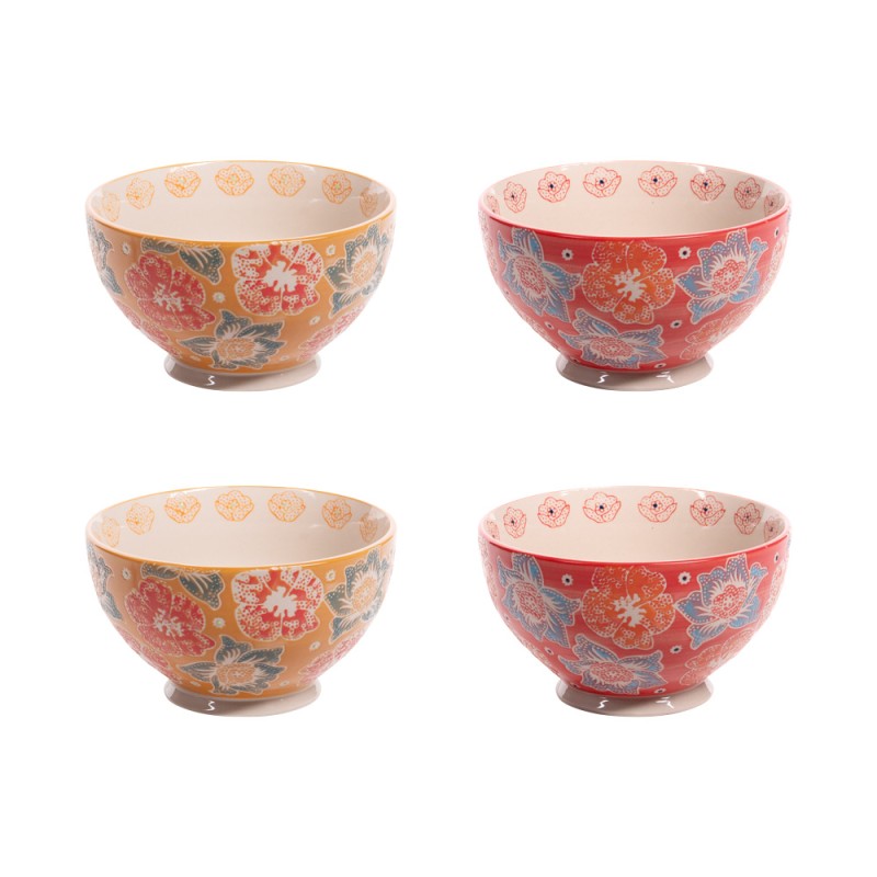 Apportez couleur et style à vos repas avec ces bols en grès aux motifs floraux rouge profond et moutarde dorée. Idéals pour soupes, céréales ou accompagnements, ils combinent praticité et élégance pour une table harmonieuse.
