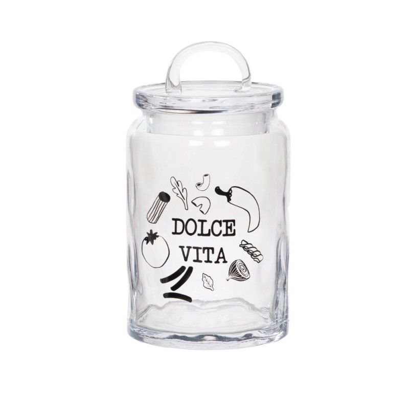 Apportez une touche italienne pleine de charme à votre cuisine avec la bonbonnière en verre Dolce Vita. Son design épuré en verre transparent met en valeur son contenu, tandis que son motif graphique noir aux inspirations méditerranéennes apporte une note décorative moderne et conviviale. Dotée d’un couvercle hermétique, elle est idéale pour conserver biscuits, bonbons, pâtes ou petits aliments du quotidien tout en les gardant visibles d’un coup d’œil. À la fois pratique et esthétique, cette bonbonnière trouve facilement sa place sur un plan de travail, une étagère ou une table, pour une ambiance chaleureuse et gourmande.