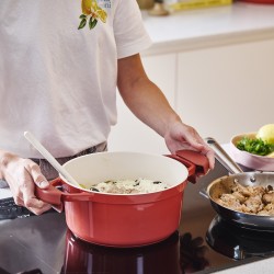Conçue en aluminium robuste et revêtue d’une céramique antiadhésive de haute qualité, cette cocotte garantit une répartition homogène de la chaleur, pour des cuissons tendres et savoureuses. Sa forme ronde est pratique pour les plats du quotidien, tandis que le rouge éclatant apporte une touche moderne et chaleureuse à votre table.