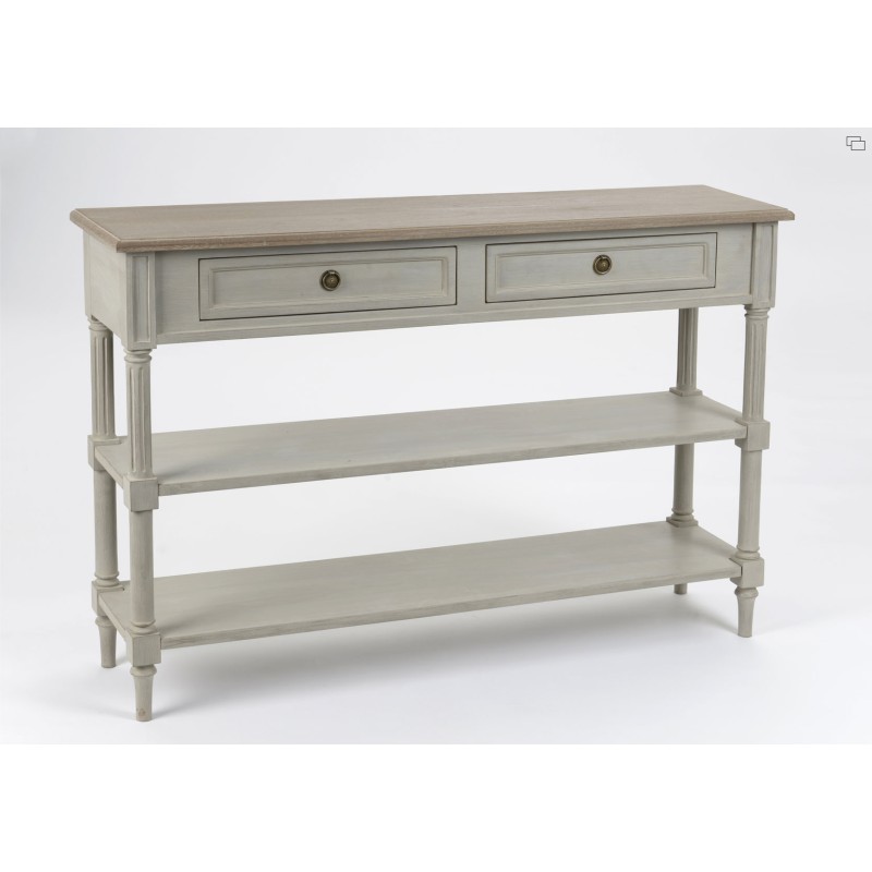 La console Édouard allie charme classique et élégance intemporelle. Sa finition gris cérusé met en valeur le veinage du bois et apporte une touche raffinée à votre intérieur. Avec ses deux tiroirs et deux étagères ouvertes, elle offre un bel espace de rangement tout en conservant une silhouette légère et équilibrée. Idéale dans une entrée, un salon ou une salle à manger, cette console au style maison de campagne chic s’accorde parfaitement avec des ambiances naturelles et chaleureuses. Livrée en kit, elle est simple à assembler pour un rendu solide et harmonieux.