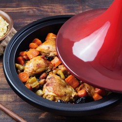 Plat à tajine Ø 32 cm, design H-Class adapté à la cuisson et au service. Couvercle conique émaillé rouge et base noire (probable fonte ou céramique) offrant restitution homogène de la chaleur. Produit attractif pour catalogue cuisine haut de gamme : visuel coloré, usage polyvalent (four, table), valorise les ventes complémentaires (accessoires de cuisson). Article proposé à l'unité, prix unitaire.