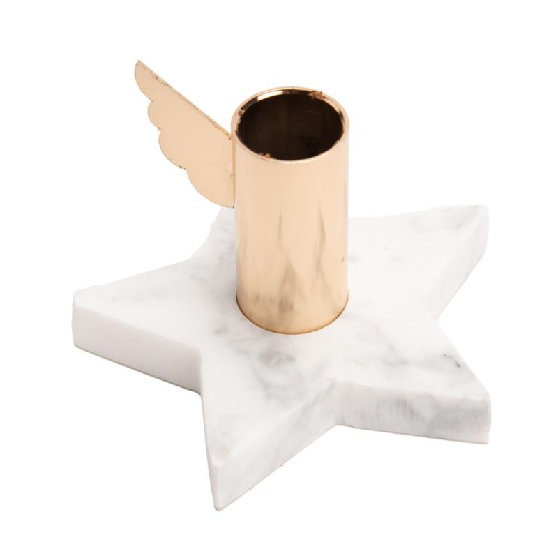 Apportez une touche d'élégance et de poésie à votre intérieur avec ce bougeoir étoile en marbre blanc. Son support doré brillant orné d'une aile délicate crée une ambiance chaleureuse et raffinée, parfaite pour sublimer vos soirées ou décorer avec style votre table ou étagère.