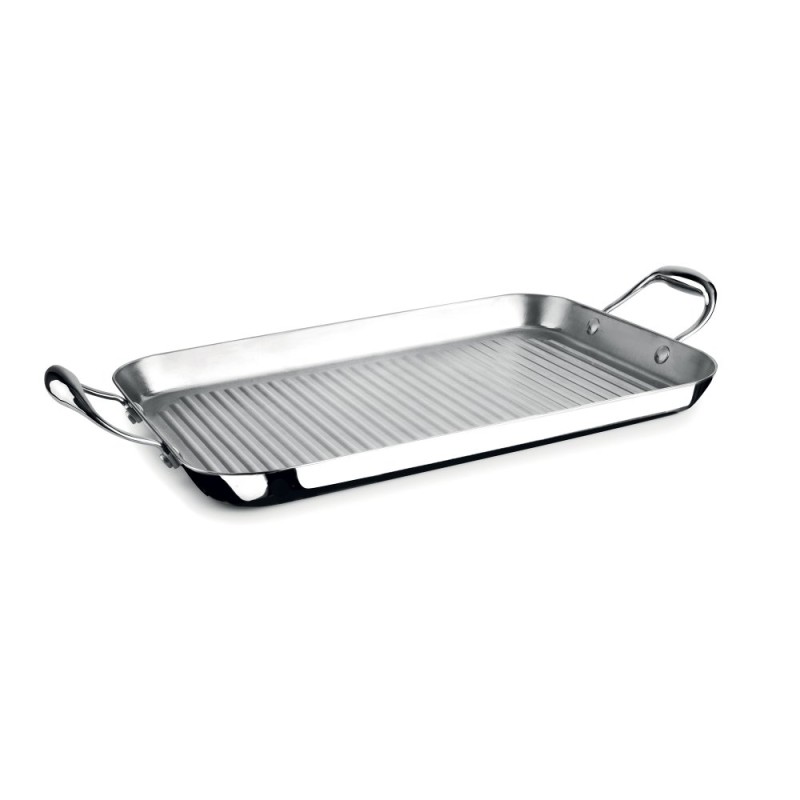 Grill plancha rectangulaire 38 x 25 cm, finition inox brillant avec surface nervurée type grill. Conception triply (fond multicouche) pour diffusion thermique homogène et montée en température rapide, adaptée à cuisson de viandes, poissons et légumes. Poignées rivetées pour manutention sûre. Article polyvalent à positionner en catalogue cuisine haut de gamme : arguments commerciaux = performance thermique, durabilité et rendu grill esthétique.