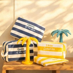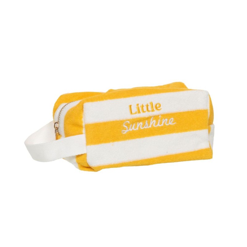 Trousse de toilette en éponge 100 % polyester, au format compact (22 x 11 x 13 cm), idéale pour compléter une offre d’accessoires et de pochettes. Signée Amadeus Les Petits, elle se distingue par sa finition rayée jaune et blanc lumineuse, accompagnée de l’inscription brodée « Little Sunshine », apportant une touche fraîche, solaire et pleine de bonne humeur. Dotée d’une poignée latérale pour une prise en main facile et d’une fermeture zippée métallique, elle allie praticité et style pour un usage quotidien. Idéal pour un enfant.