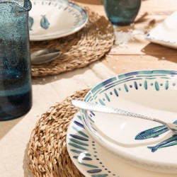 La collection Kyanos de Table Passion invite à un voyage en bord de mer. Réalisée en faïence, elle se distingue par ses motifs de poissons stylisés et ses nuances de bleu profond qui évoquent la Méditerranée. Assiettes, plats et saladiers apportent fraîcheur et authenticité à vos repas, parfaits pour des tables estivales et conviviales. Une gamme qui respire l’air marin et sublime vos moments de partage.