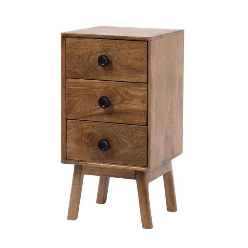 Apportez chaleur et caractère à votre chambre avec le chevet 3 tiroirs Authentique d’Amadeus. Conçu en bois de manguier massif et complété par une structure en métal, il allie robustesse et style intemporel. Sa finition chaleureuse façon authentique crée une ambiance cosy et naturelle. Grâce à son design compact (40 x 40 x 80 cm), ce chevet s’adapte parfaitement aux espaces restreints, tout en offrant trois tiroirs fonctionnels équipés de boutons ronds contrastants pour un look élégant et pratique. Son piétement en bois surélevé ajoute une touche de légèreté tout en facilitant le nettoyage. Solide et durable (22 kg), ce chevet devient à la fois un meuble pratique et un élément décoratif incontournable de votre chambre.