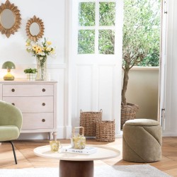 Apportez une touche de praticité et de style à votre intérieur avec ce pouf d’appoint au design contemporain. Son format compact (42 x H 42 cm) en fait une solution idéale pour optimiser l’espace tout en offrant une assise supplémentaire confortable. Revêtu d’un tissu texturé coloris vert, il séduit par son aspect chaleureux et sa finition soignée. Sa silhouette ronde, agrémentée de lignes subtilement structurées, lui confère une identité moderne qui s’intègre facilement dans tous les univers décoratifs. Fonctionnel et polyvalent, ce pouf peut être utilisé comme siège d’appoint, repose-pieds ou élément décoratif, s’adaptant ainsi à tous vos besoins du quotidien. Un indispensable pour enrichir vos collections d’assises avec une pièce à la fois esthétique, pratique et facile à intégrer.
